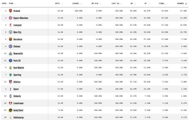 欧冠夺冠概率:阿森纳27.48%断层领先!拜仁排第二,皇马仅第九